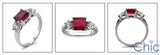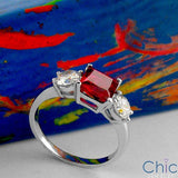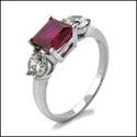 A fascinating three-stone ring with high polished shank, with high quality ruby color princess cut cubic zirconia center stone, with high quality round cut cubic zirconias on each side.