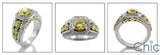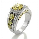 Exquisite anniversary ring, with AAA high quality round canary color stones in prong setting, surrounded by pave set round stones. Front and back view has a yellow gold design. Gallery underneath. Heavy shank. 10mm in width.