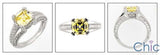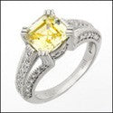 A eye-catching engagement ring with a solid engraved shank and high quality canary asscher cut cubic zirconia center stone in prong setting and round diamond cubic zirconias in pave setting on the sides.