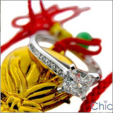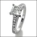 Elegant engagement ring set with AAA high quality princess cut in prong setting, sides have channel set small round stones on the band.