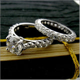 1.5 Round cz Engagement ring and an eternity band set. . This elegant cubic zirconia engagement ring set has AAA high quality, IGI certified round center stone in prong setting. The bridal ring's sides are set with brilliant cut round cubic zirconia stones in share prong setting. They gradually become smaller as they go up towards the main stone. The cubic zirconia eternity band has round cz stones set in shared prong setting as well. The engagment ring set is made in solid 14k white gold, "14K" stamp is inscribed, which is the proof for purity of Gold's karat used in making this beautiful cubic zirconia engagement ring and band.