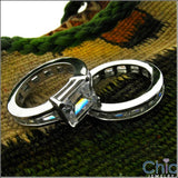 Elegant & modern matching rings set with AAA high quality emerald center in prong setting & baguette In channel on the sides. Matching eternity band with baguettes in channel as well.