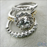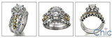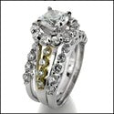 Elegant matching double band set with AAA high quality round cubic zirconia in four prongs surrounded by round smaller stones in shared prongs. Two tone shank