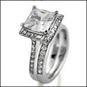 A splendid matching engagement ring set with high polished shank, with princess cut AAA quality cubic zirconia center stone set in prong setting, and diamond color round cubic zirconia stones on the sides and around the main stone in pave