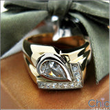 Masculine men’s ring in two tones, topped with AAA high quality pear shape in bezel setting and small round stones in pave. Heavy solid shank