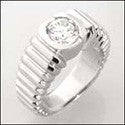 A modern mens ring design with high polished contoured solid shank and round shaped center high quality cubic zirconia in a half bezel setting.