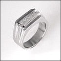 A modern mens ring design with high polished contoured solid shank and princess cut high quality cubic zirconia in channel setting.